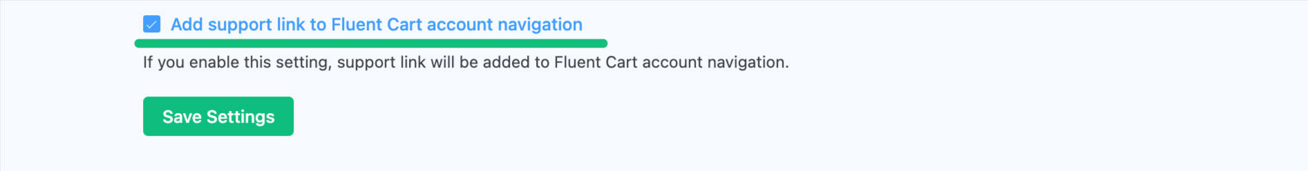 From the Fluent Support Dashboard, go to Global Settings. Scroll down to the Agent Time Tracking section and find the option Add support link to Fluent Cart account navigation.