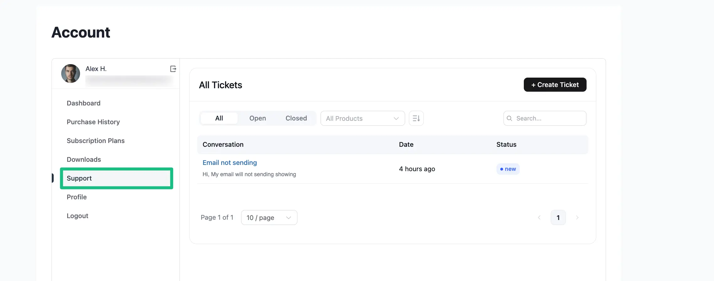 Once your custom fields are active and the portal is integrated, customers can navigate to the Support tab in their FluentCart account.