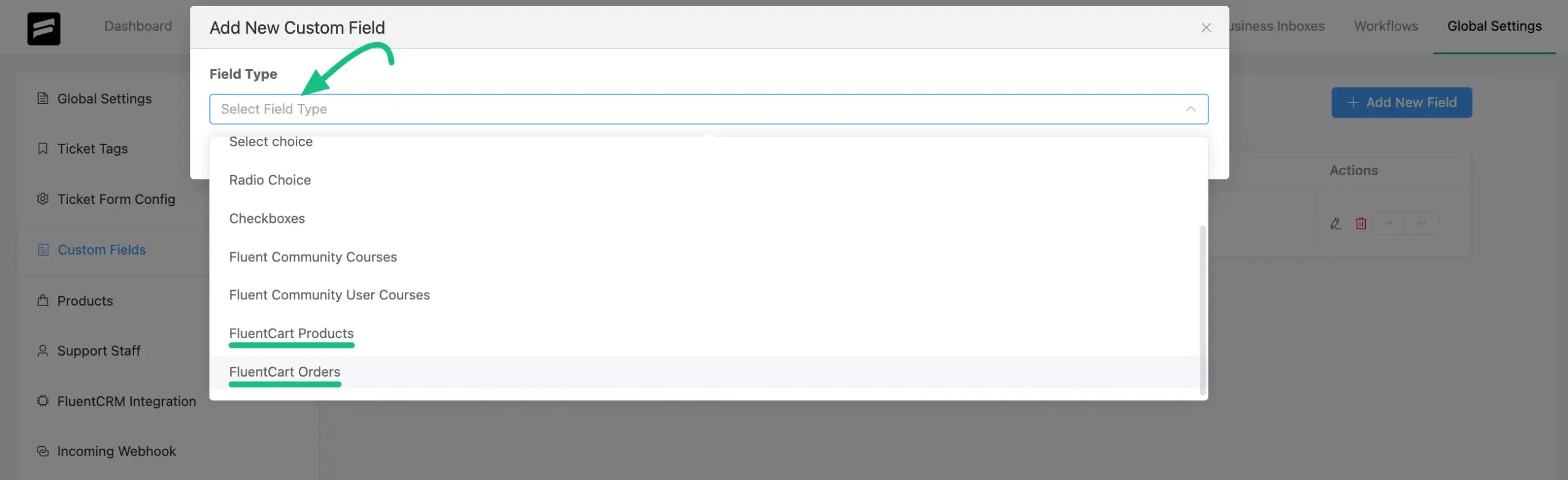 This feature is essential for collecting detailed information from customers at the moment they submit a ticket. It lets you add a dropdown field to your support form, allowing customers to choose the specific FluentCart product or order they need assistance with.
