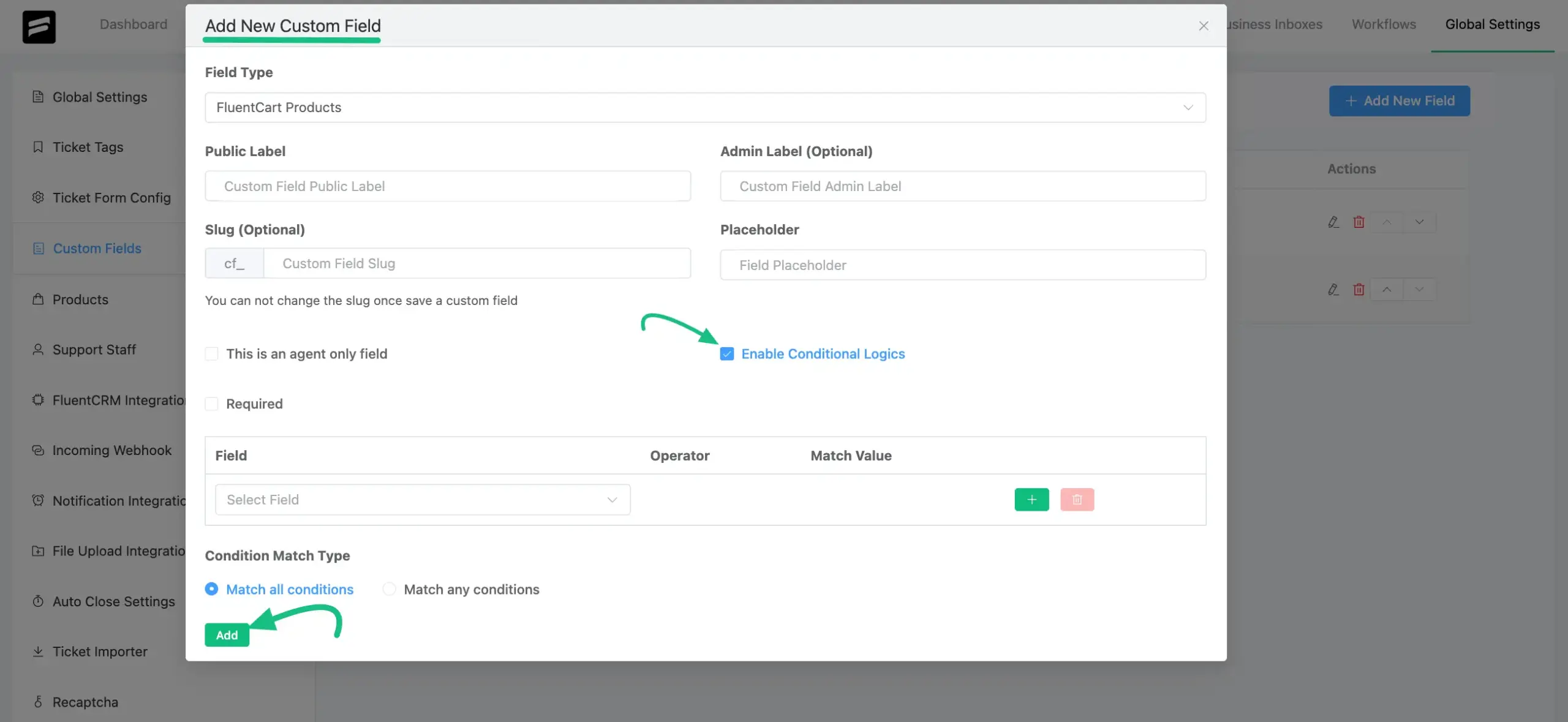 Give your Field Type a Public Label (e.g., “Select Your Product”) and configure additional fields as necessary. Also, you can enable Conditional logic if required. To save all the settings, click the Add button.