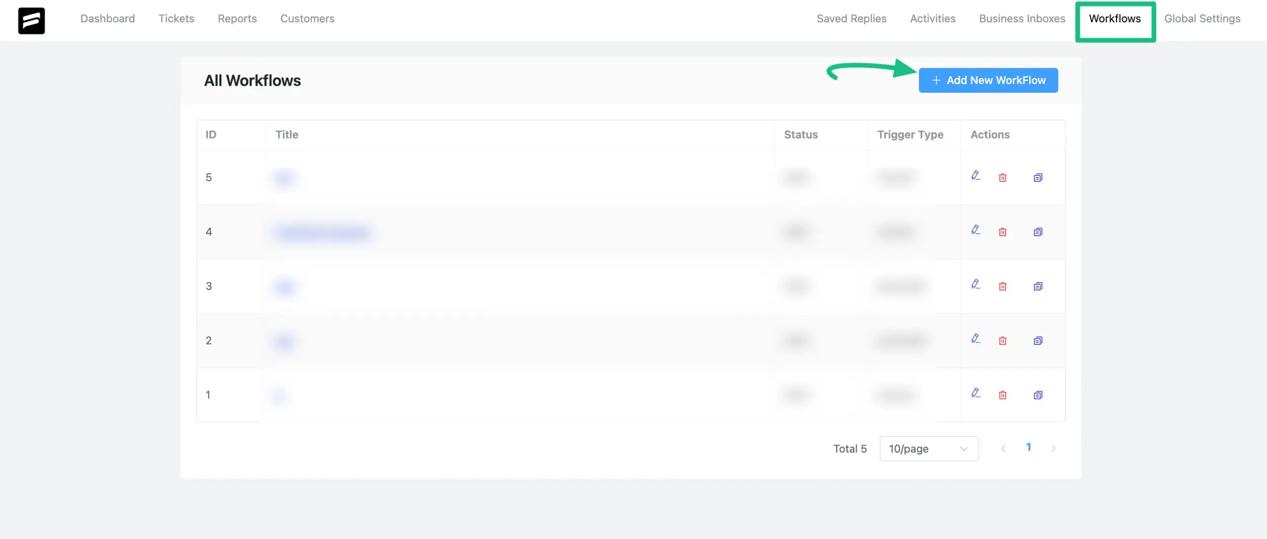 From the Fluent Support Dashboard, go to Workflows and click the + Add New Workflow button.
