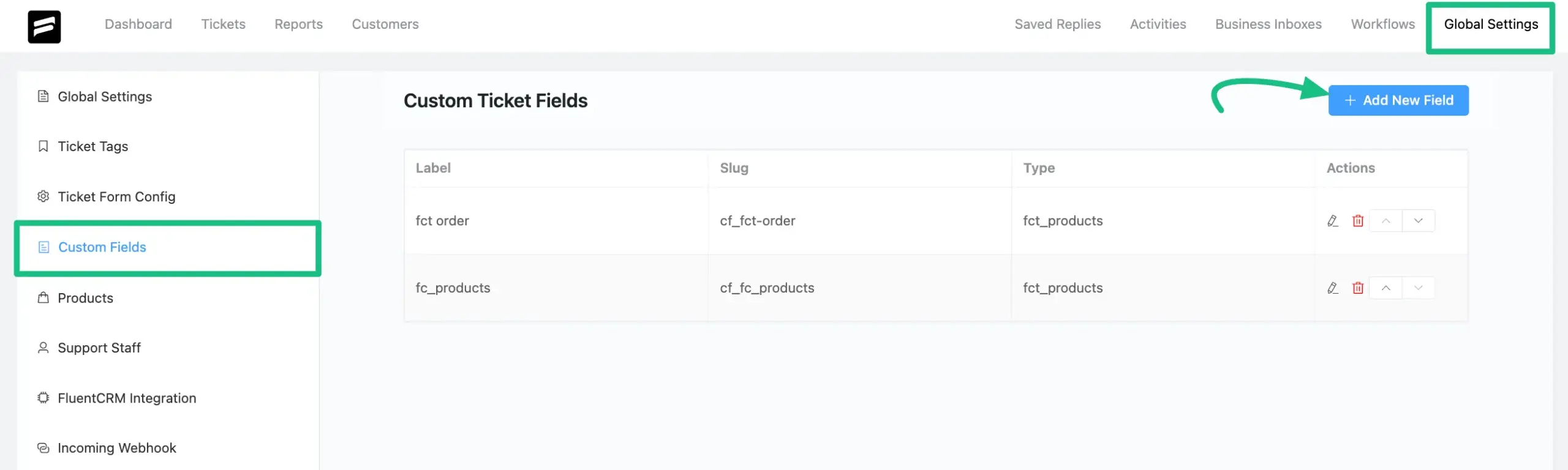 From the Fluent Support Dashboard, go to Global Settings, select Custom Fields, and click the + Add New Field button.