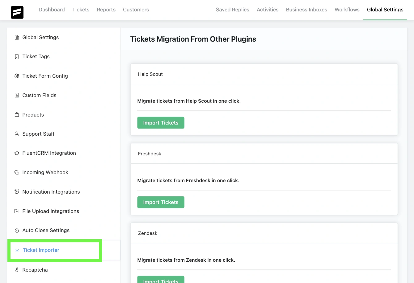 - Access the migration tool from your Fluent Support Dashboard under Global Settings → Ticket Importer